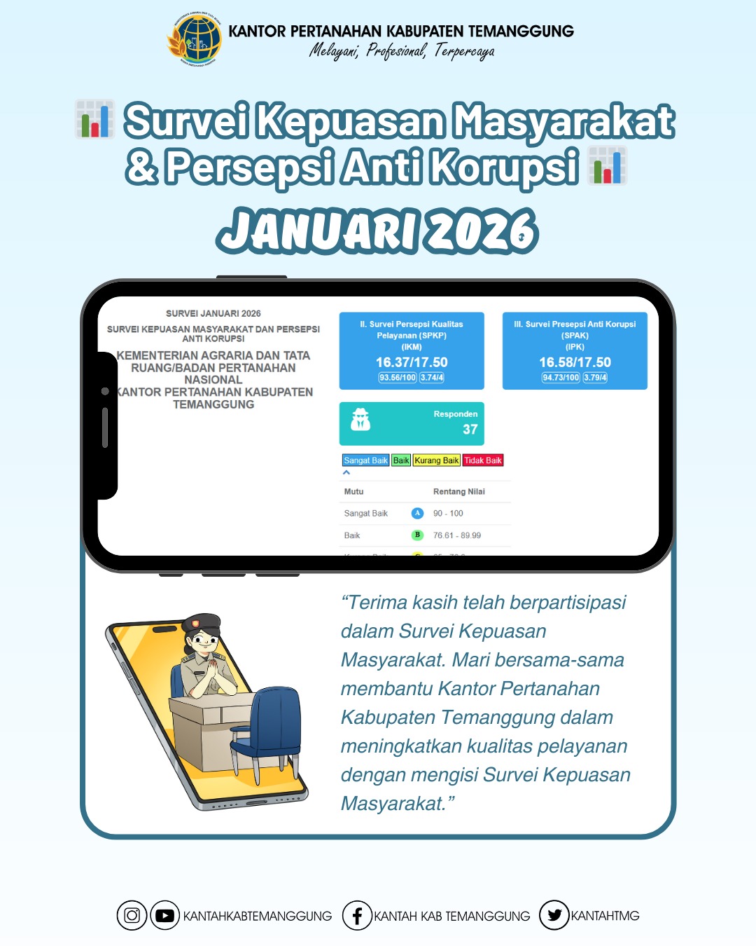 Temanggung – Kantor Pertanahan Kabupaten Temanggung telah menyelesaikan pelaksanaan Survei Kepuasan Masyarakat periode Januari 2026 sebagai bagian dari komitmen berkelanjutan…