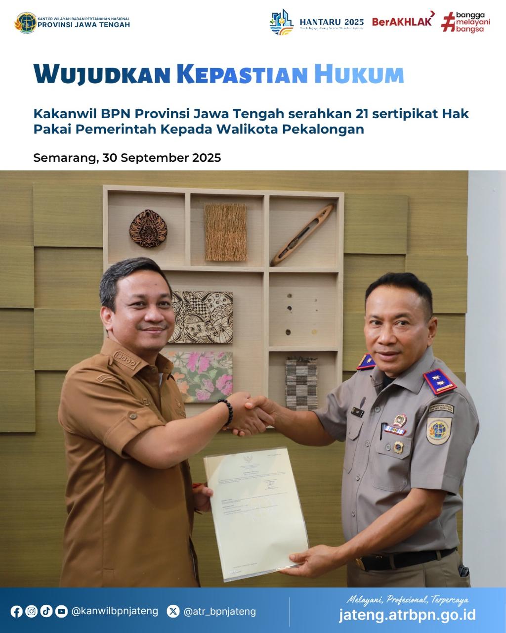 Wujudkan Kepastian Hukum, Kakanwil BPN Provinsi Jawa Tengah serahkan 21 sertipikat hak pakai pemerintah kepada Walikota Pekalongan