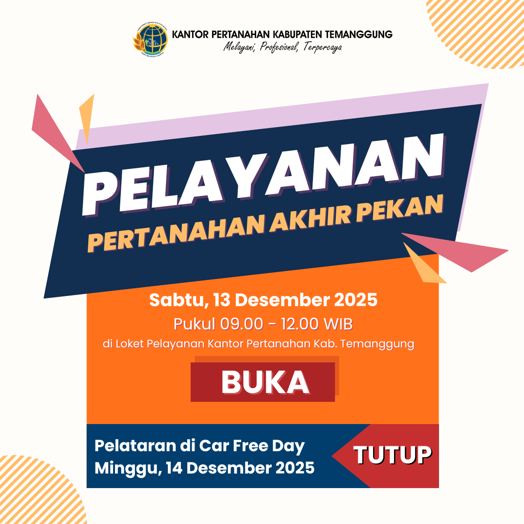 Temanggung – Kini mengurus pertanahan jadi lebih mudah dengan pelayanan yang dibuka khusus pada hari Sabtu, 13 Desember 2025 mulai…
